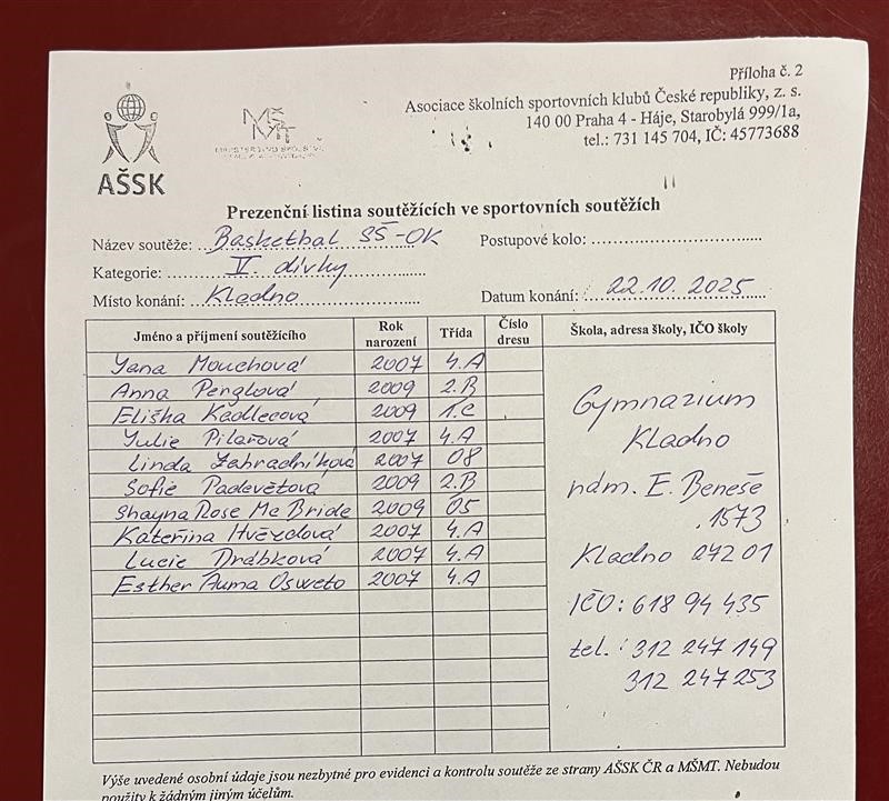 Středa 22.10.2025 se stala šťastným dnem pro naše basketbalistky ⛹♀, které s naprostým přehledem vyhrály turnaj SŠ okresního kola 💪. Svým vítězstvím si zajistily postup do krajského kola, které se bude konat v Poděbradech.