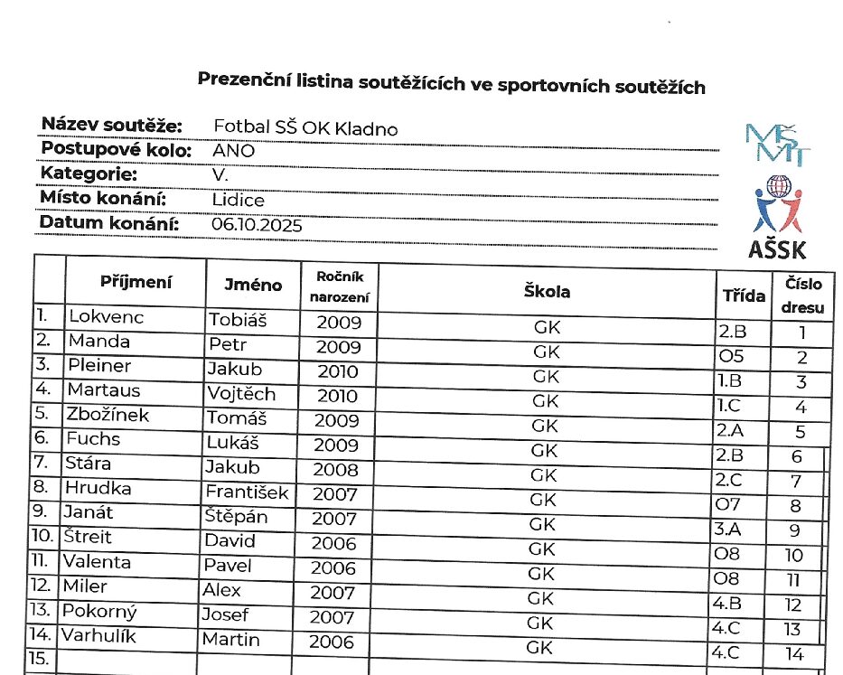 Všem hráčům děkuji za reprezentaci školy, soupisku můžete nalézt v galerii.