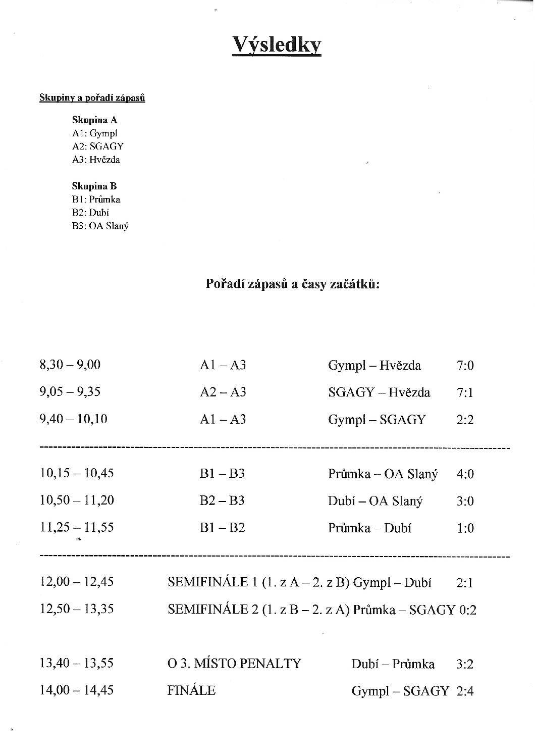 Letošního ročníku se zúčastnilo 6 škol rozdělených do 2 tříčlenných skupin, první 2 týmy postoupily do semifinále, následoval penaltový rozstřel poražených a vše vyvrcholilo pochopitelně finálem.