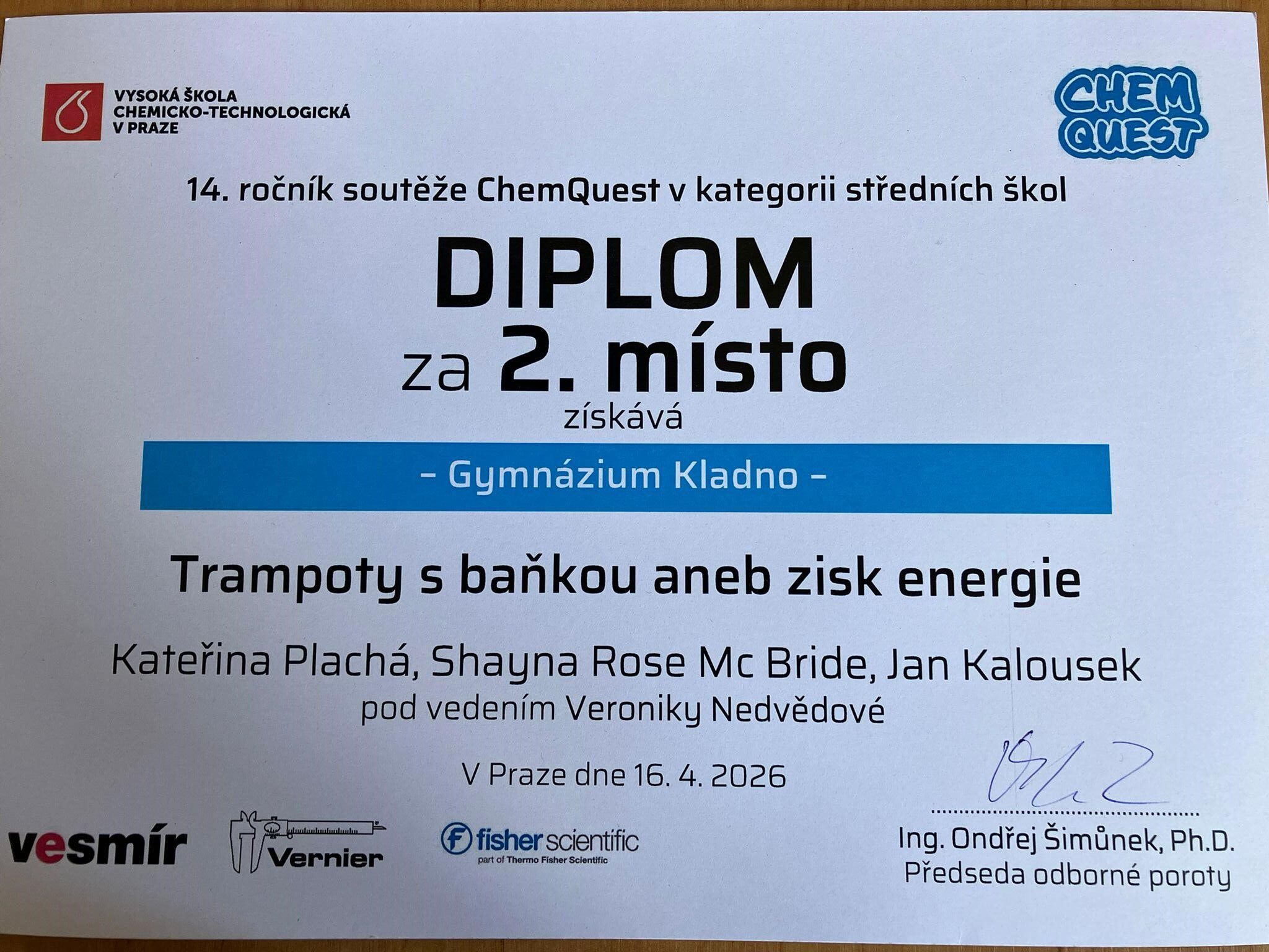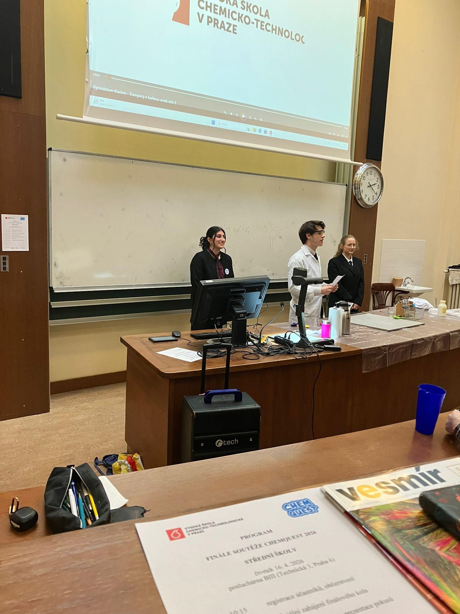 Tým našeho gymnázia obsadil skvělé 2. místo ve finále soutěže ChemQuest organizované na Vysoké škole chemicko-technologické v Praze. Moc gratulujeme všem členům týmu i prof. Nedvědové, která ho vedla.